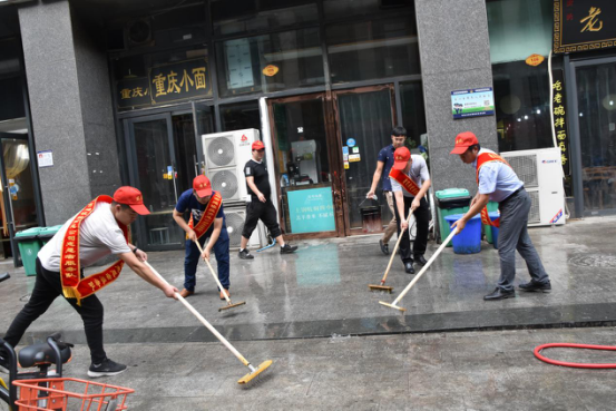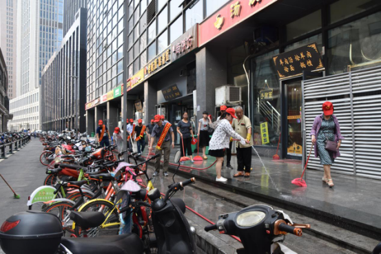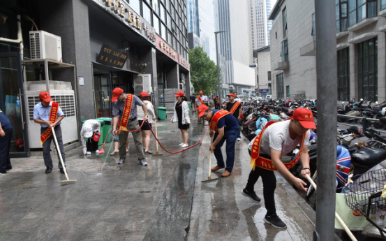 二、“全城清洁”行动。清洁家园,党员志愿者义不容辞。日前,市建投联合商务社区积极响应“全城清洁”行动号召,定期组织志愿者对社区单位公共区域、沿街商户门店等内外环境进行集中整治。7月14日下午,市建投党员志愿者分赴中国人保大厦对沿街商户门店和街道进行集中清理。大清扫活动采取包干打扫、分头行动的方式,集中对沿街商铺门店垃圾桶(池)、地面污渍等进行清洗,全面清理整治各类卫生死角,清理积存垃圾,杜绝垃圾乱堆乱放。烈日炎炎,市建投党员志愿者们丝毫不惧37度的高温,头戴小红帽,戴着红袖标,以高度的敬业态度和为人民服务的无比热情,全身心投入到环境卫生清理中,通过2个小时的辛苦劳动,使人保大厦沿街门店商铺和街道面貌焕然一新。
